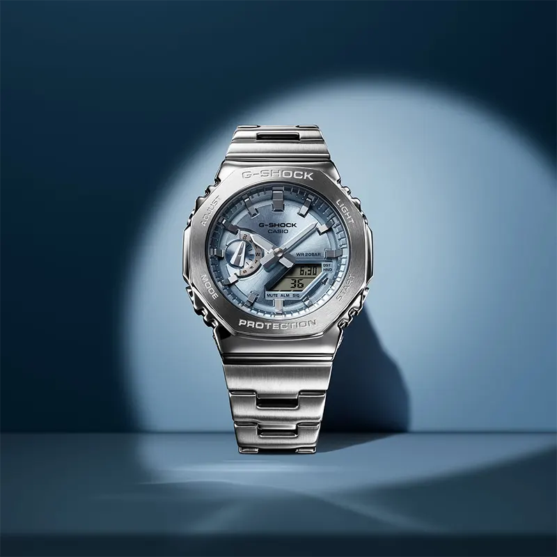 Casio G-Shock (GM-2110D-2A) features a striking ice blue dial encased in a sleek stainless steel bezel. With shock resistance, 200m water resistance, and a slim, modern design, this versatile men's watch combines durability and style, making it perfect for everyday wear and adventure seekers alike. Casio G-Shock men's watches are built for the toughest conditions, trusted by the military. Shock Resistance OutDoor, Mud Master, Rangeman, Master of G-land.