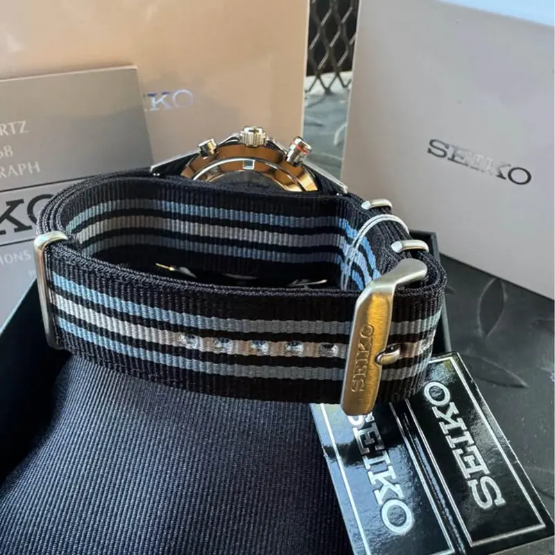 Seiko Essentials SSB409P1 is a sporty chronograph featuring a 41mm stainless steel case, vibrant blue dial with orange accents, and a striped nylon strap. Powered by the Seiko 8T63 quartz movement, it offers chronograph functionality, date display, tachymeter scale, and 100m water resistance—combining performance and style. Check out our massive men's watch a variety of trending to niche watch brands, including Emporio Armani, Fossil, Tommy Hilfiger, Hugo Boss, Michael Kors, and Tissot.